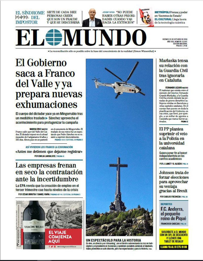 EL MUNDO: "El Gobierno saca a Franco del Valle y ya prepara nuevas exhumaciones. Así vivieron los Franco la exhumación: "Antes me detienen que dejarme registrar. Un espectáculo para la historia"; "Las empresa frenan en seco la contratación ante la incertidumbre"; "Marlaska tensa su relación con la Guardia Civil tras ignorarla en Cataluña"; "El PP plantea suprimir el veto a la Policía en la universidad catalana"; "Johnson trata de forzar elecciones para aprovechar su ventaja gracias al Brexit"; "F.C. Andorra, el pequeño reino de Piqué".