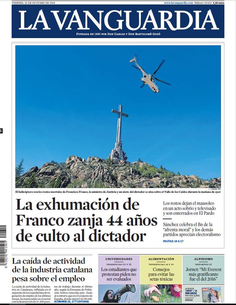 LA VANGUARDIA: "La exhumación de Franco zanja 44 años de culto al dictador"; "La caída d ela actividad de la industria catalana pesa sobre el empleo"; "Los estudiantes que protestan piden no ser evaluados"; "Consejos para evitar las setas tóxicas"; "Jornet: "Mi Everest más gratificante fue el de 2016".