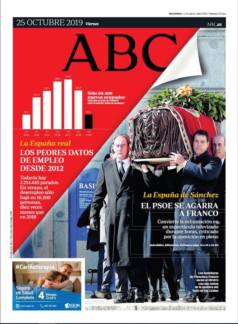 ABC: "La España de Sánchez: El PSOE se agarra a Franco. Convierte la exhumación en un espectáculo televisado durante horas, criticado por la oposición en pleno. La España real: los peores datos de empleo desde 2012. Todavía hay 3.214.440 parados. En verano, el desempleo sólo bajó en 16.200 personas, diez veces menos que en 2008".