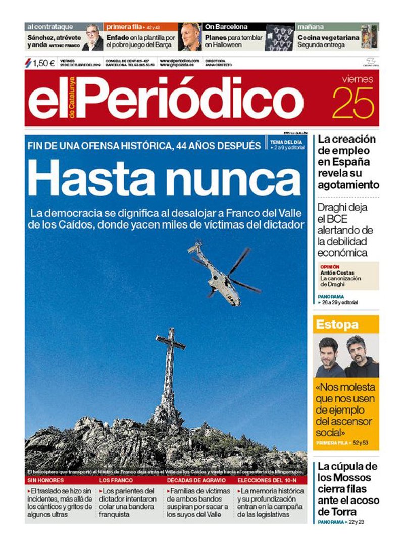 EL PERIÓDICO: "Hasta nunca. La democracia se dignifica al desalojar a Franco del Valle de los Caídos, donde yacen miles de víctimas del dictador"; "La creación de empleo en España revela su agotamiento"; "Draghi deja el BCE alertando de la debilidad de la economía"; "Estopa: "Nos molesta que nos usen de ejemplo del ascensor social""; "La cúpula de los Mossos cierra filas ante el acoso de Torra".