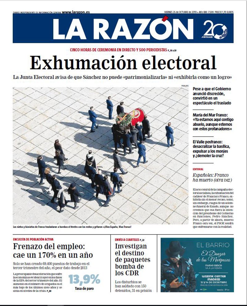 LA RAZÓN: "Exhumación electoral. Pese a que el Gobierno anunció discreción, convirtió en un espectáculo el traslado. María del Mar Franco: "Ya estamos aquí contigo abuelo, aunque estemos con estos profanadores". El Valle posfranco: desacralizar la basílica, expulsar a los monjes y ¿demoler la cruz?"; "Frenazo del empleo: cae un 170% en un año"; "Investigan el destino de paquetes bomba de los CDR".