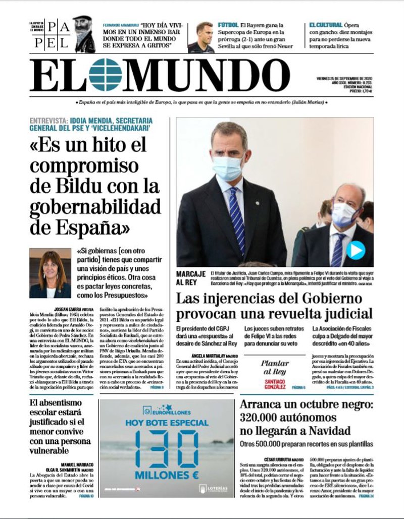 EL MUNDO: "Idoia Mendia, secretaria general del PSE y 'vicelehendakari': "Es un hito el compromiso de Bildu con la gobernabilidad de España""; "Las injerencias del Gobierno provocan una revuelta judicial"; "Arranca un octubre negro: 320.000 autónomos no llegarán a Navidad"; "El absentismo escolar estará justificado si el menor convive con una persona vulnerable".