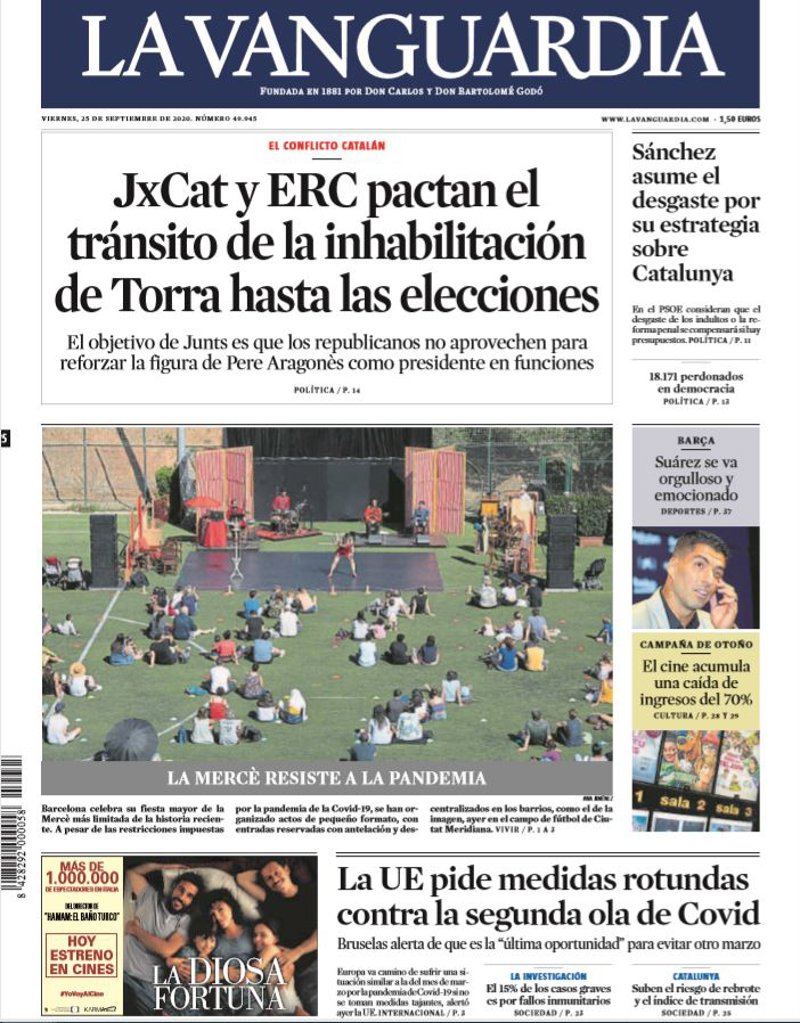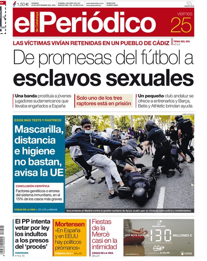 EL PERIÓDICO: "De promesas del fútbol a esclavos sexuales. Una banda prostituía a jóvenes jugadores sudamericanos que llevaba engañados a España. Solo uno de los tres raptores está en prisión"; "Mascarilla, distancia e higiene no bastan, avisa la UE"; "El PP intenta vetar por ley los indultos a los presos del 'procés'"; "Mortensen: "En España y en EEUU hay políticos pirómanos""; "Fiesta de la Mercè casi en la intimidad".