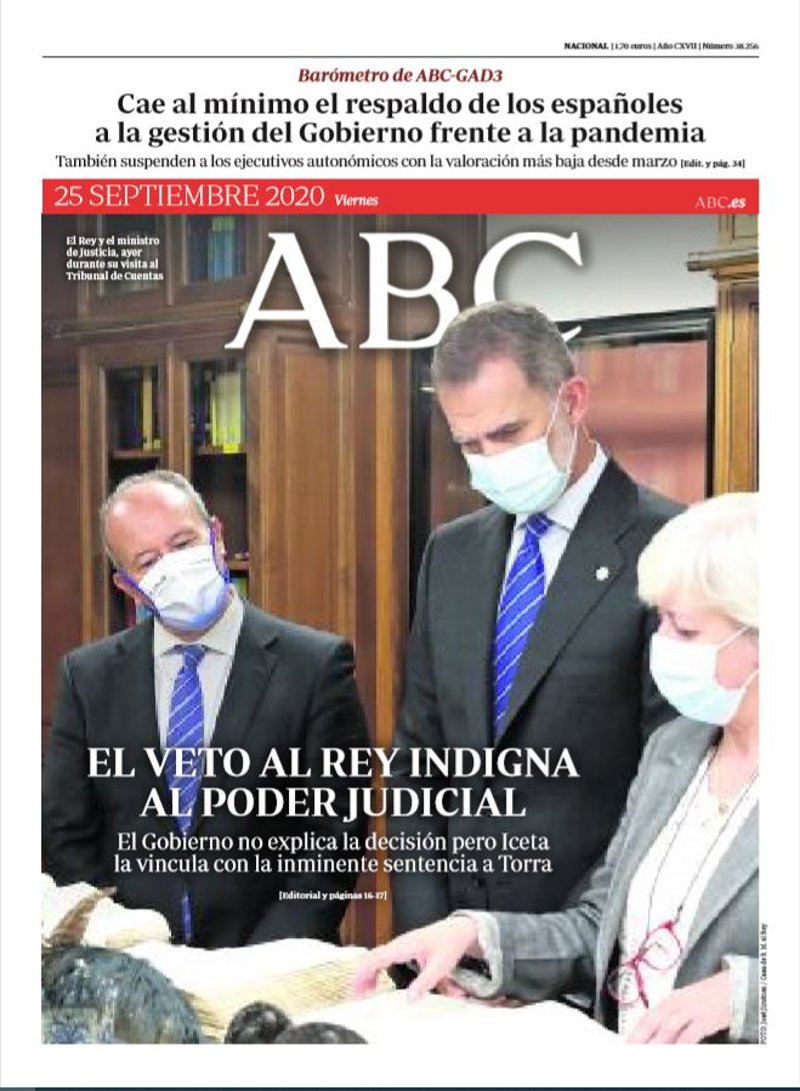 ABC: "El veto al Rey indigna al Poder Judicial. El Gobierno no explica la decisión pero Iceta la vincula con la inminente sentencia a Torra"; "Cae al mínimo el respaldo de los españoles a la gestión del Gobierno frente a la pandemia".