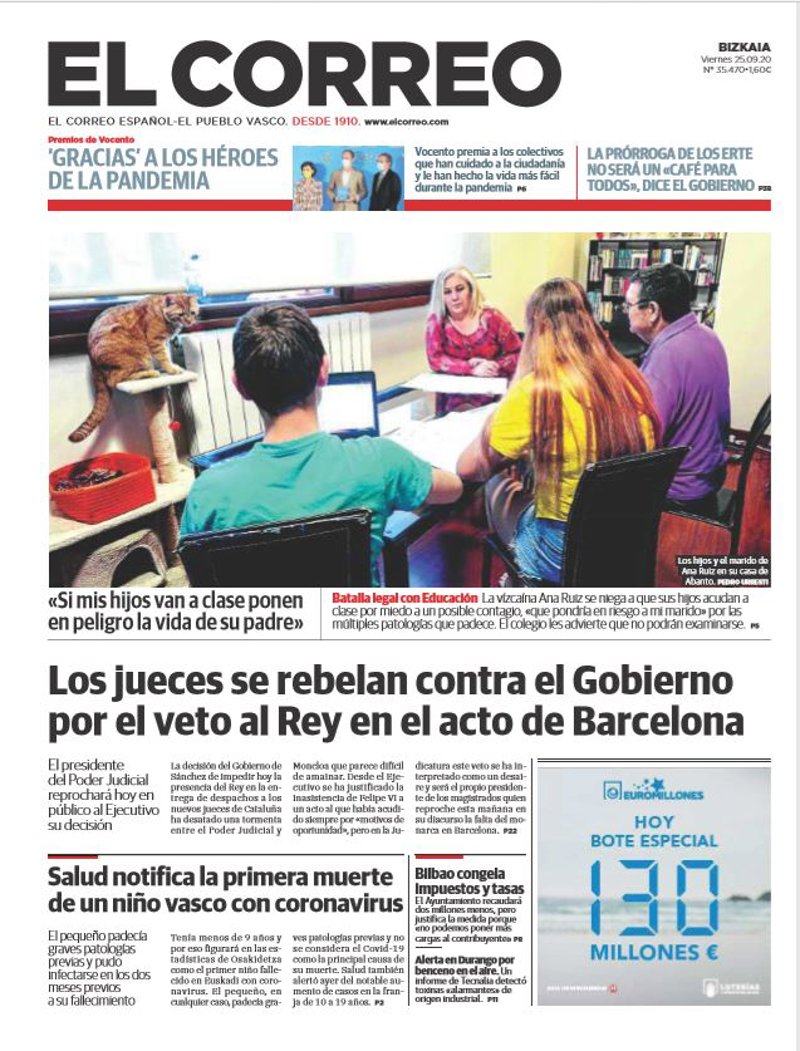 EL CORREO: "Batalla legal con educación. "Si mis hijos van a clase ponen en peligro la vida de su padre""; "Los jueces se rebelan contra el Gobierno por el veto al Rey en el acto de Barcelona"; "Salud notifica la primera muerte de un niño vasco con coronavirus"; "Bilbao congela impuestos y tasas".