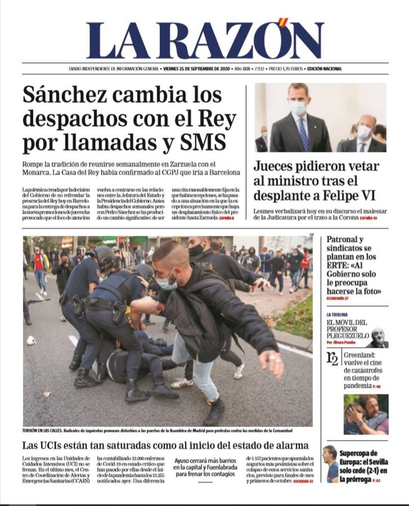 LA RAZÓN: "Sánchez cambia los despachos con el Rey por llamadas y SMS"; "Las UCIs están tan saturadas como al inicio del estado de alarma. Ayuso cerrará más barrios en la capital y Fuenlabrada para frenar los contagios"; "Jueces pidieron vetar al ministro tras el desplante a Felipe VI"; "Patronal y sindicatos se plantan en los ERTE: "Al Gobierno solo le preocupa hacerse la foto"".