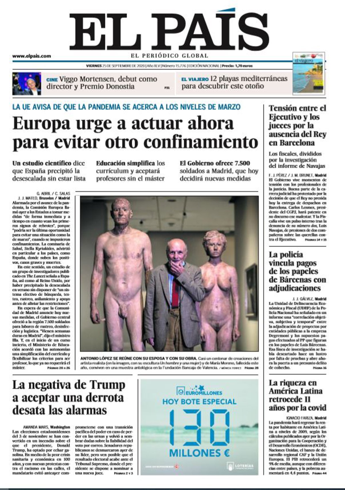 EL PAÍS: "Europa urge a actuar ahora para evitar otro confinamiento"; "Antonio López se reúne con su esposa y con su obra"; "La negativa de Trump a aceptar una derrota desata las alarmas"; "Tensión entre el Ejecutivo y los jueces por la ausencia del Rey en Barcelona"; "La policía vincula pagos de los papeles de Bárcenas con adjudicaciones"; "La riqueza en América Latina retrocede 11 años por la covid".