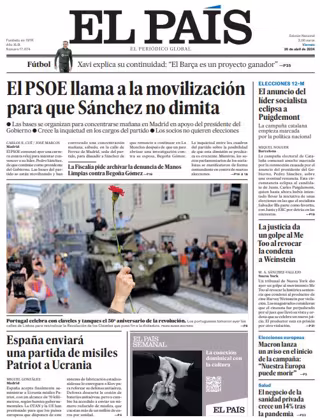 EL PAÍS: "El PSOE llama a la movilización para que Sánchez no dimita"; "España enviará una partida de misiles Patriot a Ucrania"; "El anuncio del líder socialista eclipsa a Puigdemont"; "La justicia da un golpe al Me Too al revocar la condena a Weinstein"; "Macron lanza un aviso en el inicio de la campaña: "Nuestra Europa puede morir"; "El negocio de la sanidad privada crece un 14% tras la pandemia".