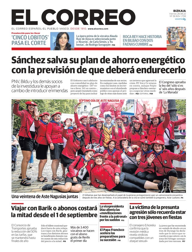 EL CORREO: "Sánchez salva su plan de ahorro energético con la previsión de que deberá endurecerlo"; "Viajar con Barik o abonos costará la mitad desde el 1 de septiembre"; "La vicepresidenta Díaz alienta las movilizaciones frente a la patronal por los sueldos"; "El Papa Francisco acelera los preparativos para su sucesión"; "La víctima de la presunta agresión sólo recuerda estar con tres jóvenes en fiestas".