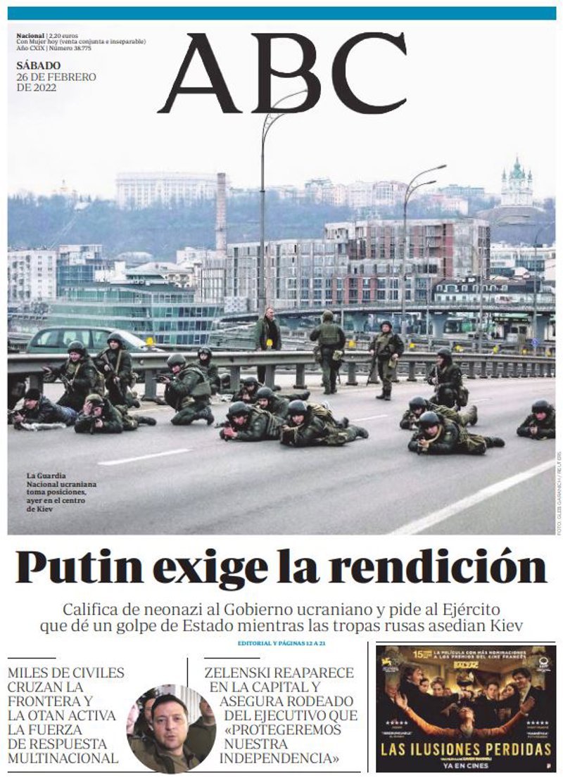 ABC: "Putin exige la rendición. Califica de neonazi al Gobierno ucraniano y pide al Ejército que dé un golpe de Estado mientras las tropas rusas asedian Kiev".