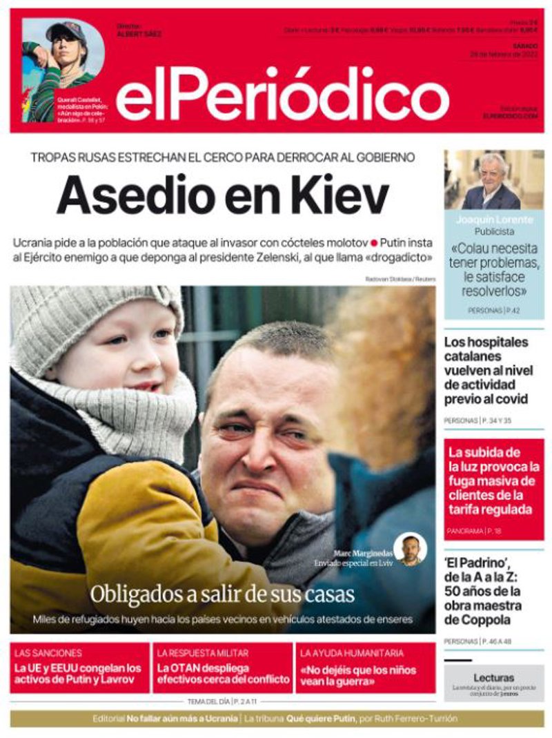 EL PERIÓDICO: "Asedio en Kiev"; "Obligados a salir de sus casas"; "La UE y EEUU congelan los activos de Putin y Lavrov"; "La OTAN despliega efectivos cerca del conflicto"; ""No dejéis que los niños vean la guerra""; "Joaquín Lorente, publicista: "Colau necesita tener problemas, le satisface resolverlos""; "Los hospitales catalanes vuelven al nivel de actividad previo al covid"; "La subida de la luz provoca la fuga masiva de clientes de la tarifa regulada"; "'El Padrino', de la A a la Z: 50 años de la obra maestra de Coppola".