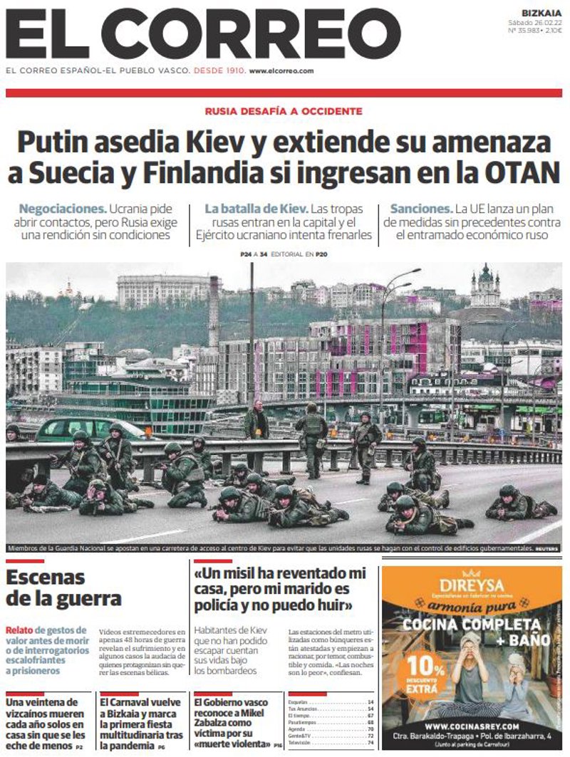 EL CORREO: "Putin asedia Kiev y extiende su amenaza a Suecia y Finlandia si ingresan en la OTAN"; "Escenas de la guerra"; ""Un misil ha reventado mi casa, pero mi marido es policía y no puedo huir""; "Una veintena de vizcaínos mueren cada año solos en casa sin que se les eche de menos"; "El Carnaval vuelve a Bizkaia y marca la primera fiesta multitudinaria tras la pandemia"; "El Gobierno vasco reconoce a Mikel Zabalza como víctima por su "muerte violenta"".