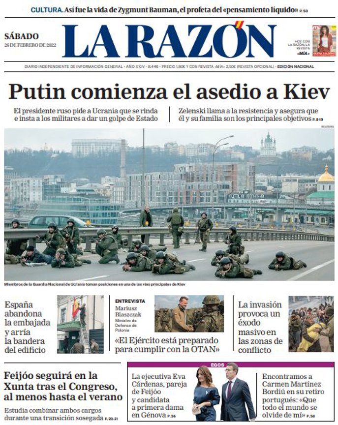 LA RAZÓN: "Putin comienza el asedio a Kiev"; "España abandona la embajada y arría la bandera del edificio"; "Mariusz Blaszczak, ministro de Defensa de Polonia: "El Ejército está preparado para cumplir con la OTAN""; "La invasión provoca un éxodo masivo en las zonas de conflicto"; "Feijóo seguirá en la Xunta tras el Congreso, al menos hasta el verano".