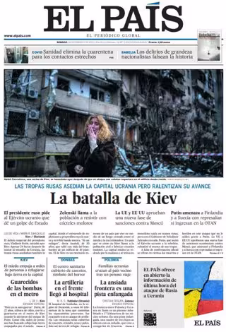 EL PAÍS: "La batalla de Kiev"; "Guarecidos de las bombas en el metro"; "La artillería en el frente llegó al hospital"; "La ansiada frontera es una pista enfangada".