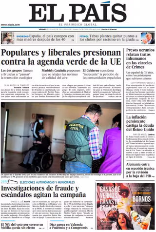 EL PAÍS: "Populares y liberales presionan contra la agenda verde de la UE"; "Investigaciones de fraude y escándalos agitan la campaña"; "Presos ucranios relatan tratos inhumanos en las cárceles de Crimea"; "La inflación persistente castiga la deuda del Reino Unido"; "Alemania entra en recesión técnica por la revisión a la baja del PIB".
