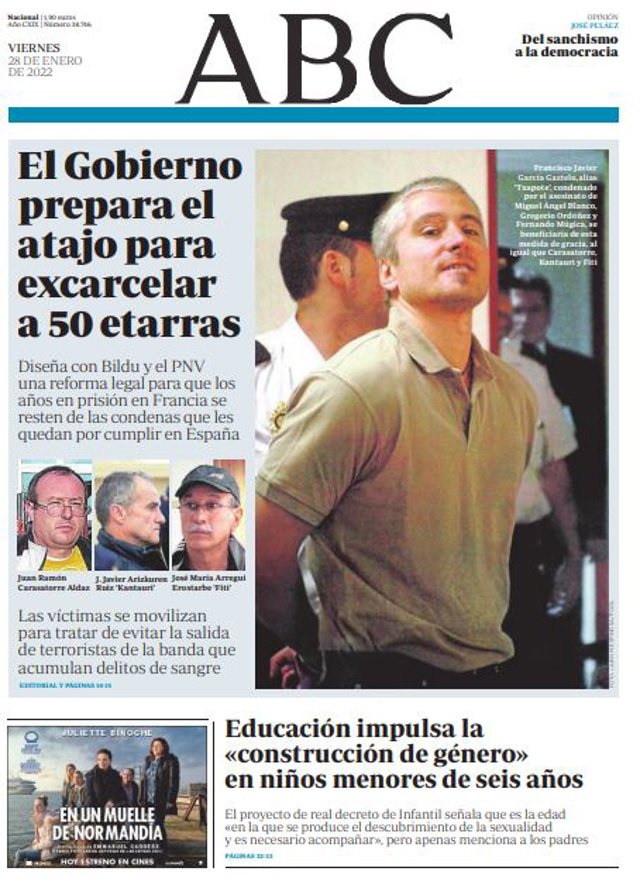 ABC: "El Gobierno prepara el atajo para excarcelar a 50 etarras"; "Educación impulsa la 'construcción de género' en niños menores de seis años".