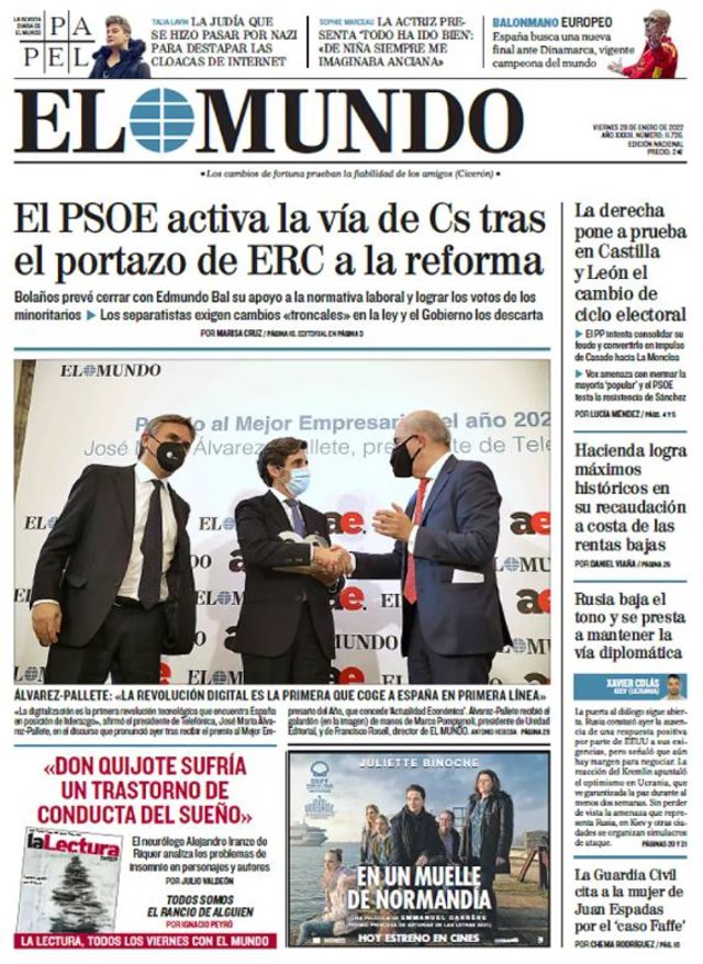 EL MUNDO: "El PSOE activa la vía de Cs tras el portazo de ERC a la reforma"; "La derecha pone a prueba en Castilla y León el cambio de ciclo electoral"; "Hacienda logra máximo históricos en su recaudación a costa de las rentas bajas"; "Rusia baja el tono y se presta a mantener la vía diplomática"; "La Guardia Civil cita a la mujer de Juan Espadas por el 'caso Faffle'".