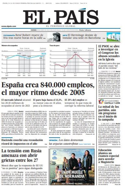 EL PAÍS: "España crea 840.000 empleos, el mayor ritmo desde 2005"; "La tensión con Rusia amenaza con abrir grietas entre los 27"; "El PSOE se abre a investigar en el Congreso los abusos sexuales en la Iglesia"; "La mitad de los partidos, aún sin programa en el inicio de la campaña"; "Educación plantea un examen especial