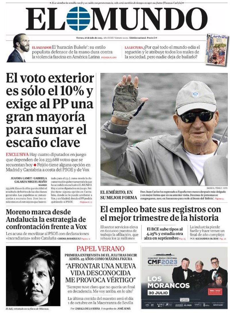 EL MUNDO: "El voto exterior es sólo el 10% y exige una gran mayoría para sumar el escaño clave"; "Moreno marca desde Andalucía la estrategia de confrontación frente a Vox"; "El empleo bate sus registros con el mejor trimestre de la historia".