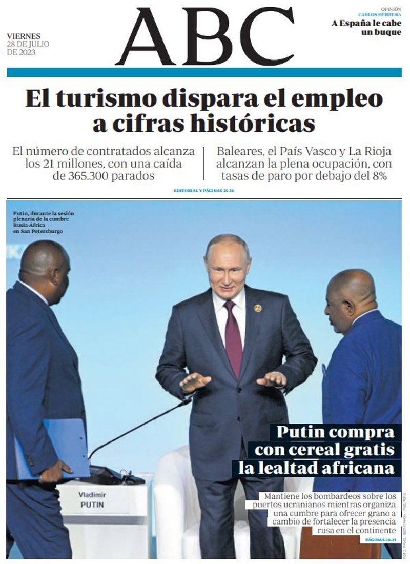ABC: "El turismo dispara el empleo a cifras históricas. El número de contratados alcanza los 21 millones, con una caída de 365.300 parados. Baleares, el País Vasco y La Rioja alcanzan la plena ocupación, con tasas de paro por debajo del 8%"; "Putin compra con cereal gratis la lealtad africana. Mantiene los bombardeos sobre los puertos ucranianos mientras organiza una cumbre para ofrecer grano a cambio de fortalecer la presencia rusa en el continente".