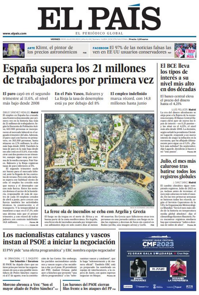 EL PAÍS: "España supera los 21 millones de trabajadores por primera vez"; "Los nacionalistas catalanes y vascos instan al PSOE a iniciar la negociación"; "El BCE lleva los tipos de interés a su nivel más alto en dos décadas"; "Julio, el mes más caluroso tras batirse todos los registros globales".