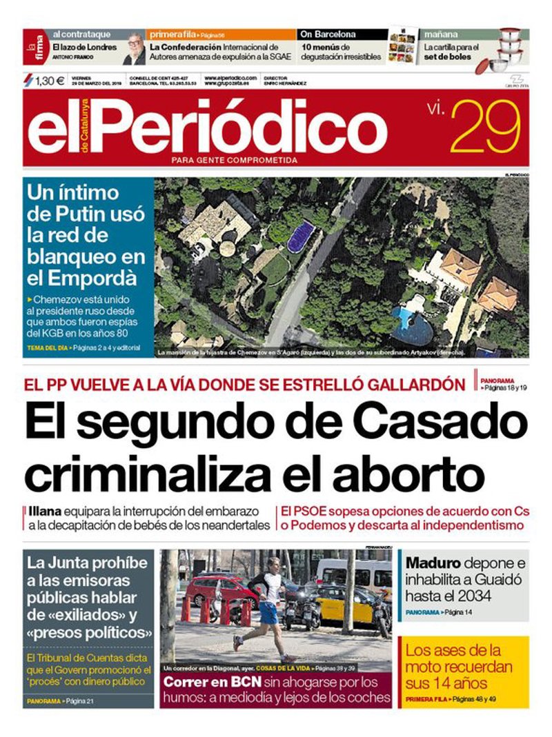 EL PERIÓDICO: "El segundo de Casado criminaliza el aborto"; "Un íntimo de Putin usó la red de blanqueo en el Empordà"; "La Junta prohíbe a las emisoras públicas hablar de 'exiliados' y 'presos políticos'"; "Correr en BCN sin ahogarse por los humos: a mediodía y lejos de los coches"; "Maduro depone e inhabilita a Guaidó hasta el 2034".