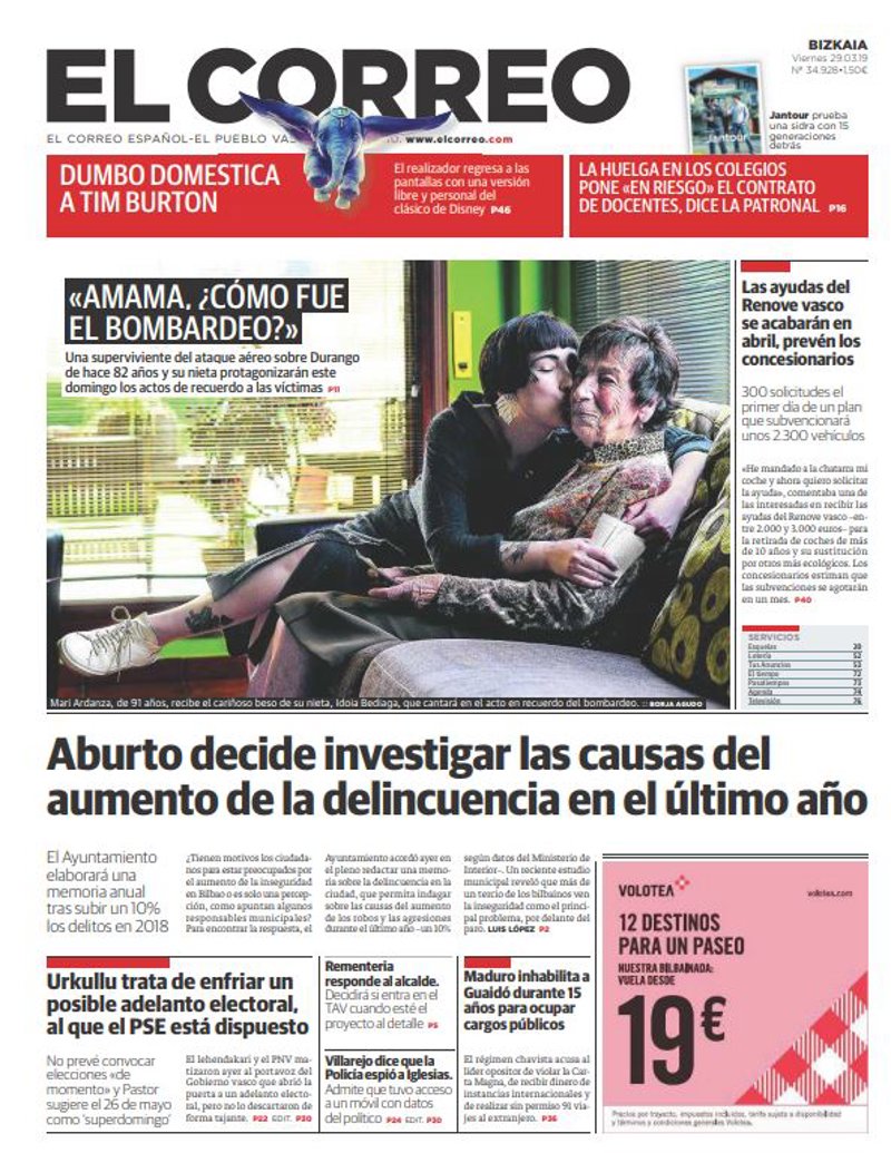 EL CORREO: "'Amama, ¿cómo fue el bombardeo'"; "Aburto decide investigar las causas del aumento de la delincuencia en el último año"; "Urkullu trata de enfriar un posible adelanto electoral, al que el PSE está dispuesto"; "Las ayudas del Renove vasco se acabarán en abril, prevén los concesionarios"; "Maduro inhabilita a Guaidó durante 15 años para ocupar cargos públicos".