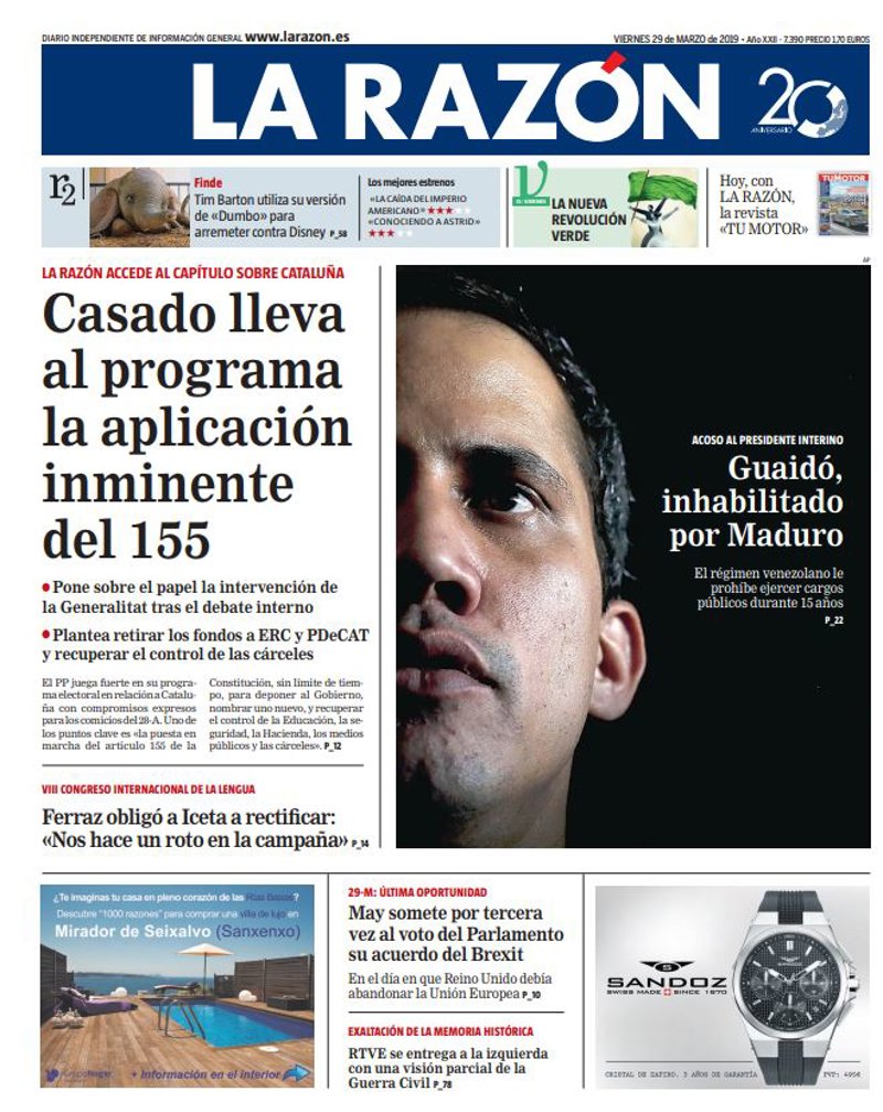 LA RAZÓN: "Casado lleva al programa la aplicación inminente del 155"; "Guaidó, inhabilitado por Maduro"; "Ferraz obligó a Iceta a rectificar: 'Nos hace un roto en la campaña'"; "May somete por tercera vez al voto del Parlamento su acuerdo del Brexit"; "RTVE se entrega a la izquierda con una visión parcial de la Guerra Civil".