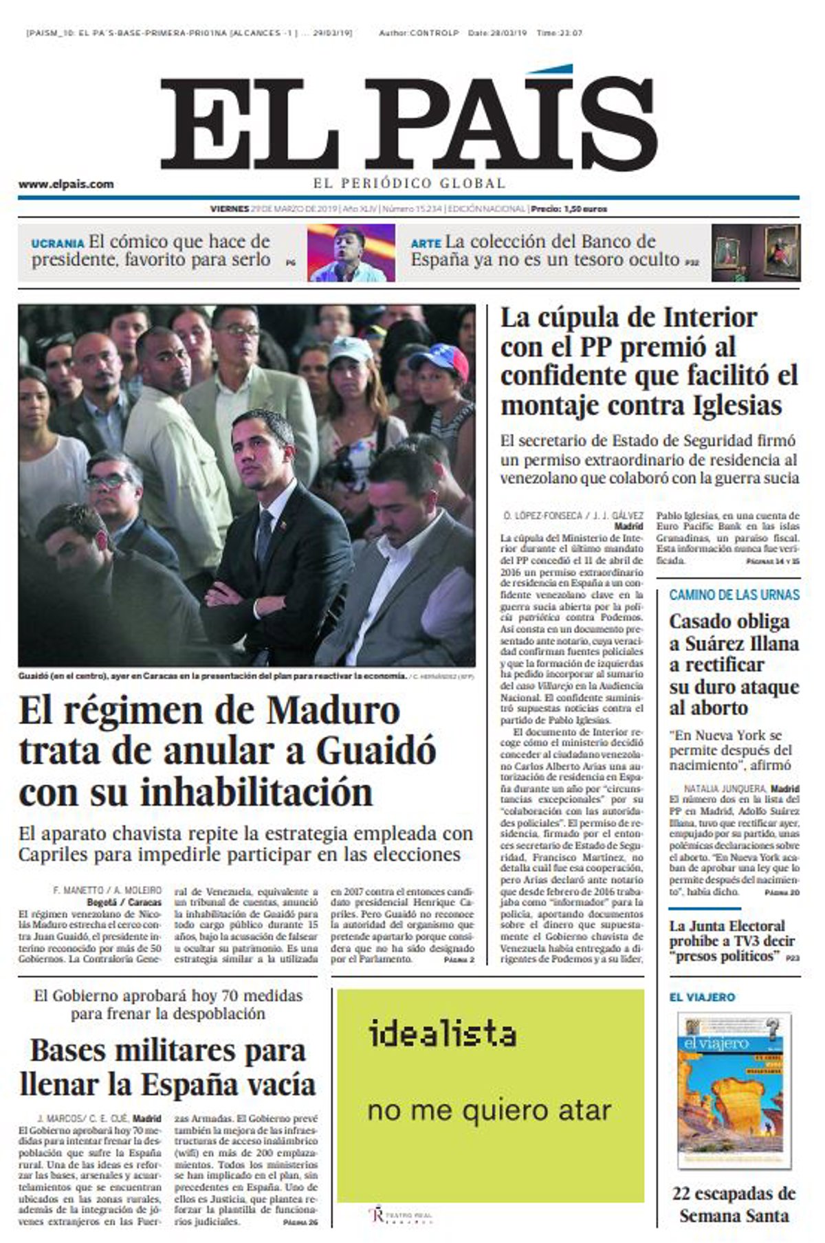 EL PAÍS: "La cúpula de Interior con el PP premió al confidente que facilitó el montaje contra Iglesias"; "El régimen de Maduro trata de anular a Guaidó con su inhabilitación"; "Casado obliga a Suárez Illana a rectificar su duro ataque al aborto"; "Bases militares para llenar la España vacía"; "La Junta Electoral prohíbe a TV3 decir 'presos políticos'".