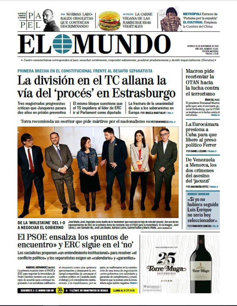 EL MUNDO: "La división en el TC allana la vía del 'procés' en Estrasburgo. Torra recomienda un escritor que pide mártires por el nacionalismo"; "El PSOE ensalza los "puntos de encuentro" y ERC sigue en el 'no'. De la 'moleskine' del 1-0 a negociar con el Gobierno. José Maria Jové, imputado como dueño de la 'moleskine' que marcaba la hoja de ruta del procés', fue uno de los representantes de ERC en la primera toma de contacto con el PSOE para la investidura"; "Macron pide reorientar la OTAN hacia la lucha contra el terrorismo"; "La Eurocámara presiona a Cuba para que libere al preso político Ferrer"; "De Venezuela a Menorca, los dos crímenes del asesino del 'jacuzzi'"; "Robert Moreno: "Si yo no hubiera seguido Luis Enrique no sería hoy seleccionador".