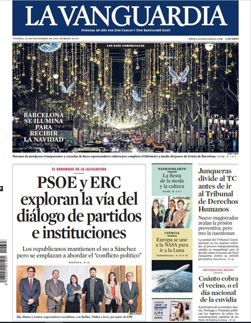 LA VANGUARDIA: "Barcelona se ilumina para recibir la Navidad"; "PSOE y ERC exploran la vía del diálogo de partidos e instituciones. Los republicanos mantienen el no a Sánchez pero se emplazan a abordar el "conflicto político""; "Junqueras divide al TC antes de ir al Tribunal de Derechos Humanos"; "Cuánto cobra el vecino, o el día nacional de la envidia"; "Europa se une a la NASA para ir a la Luna".
