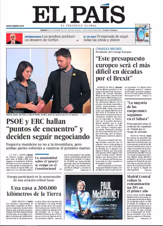 EL PAÍS: "PSOE y ERC hallan "puntos de encuentro" y deciden seguir negociando. La unanimidad sobre el 'procés' se rompe en el Constitucional"; "Una casa a 30.000 kilómetros de la Tierra. Europa participa en la construcción de una estación orbital lunar"; "Charles Michel, presidente del Consejo Europeo: "Este presupuesto europeo será el más difícil en décadas por el Brexit""; ""La mayoría de los cooperantes seguimos en el Sáhara""; "Madrid Central reduce la contaminación un 20% en el primer año".