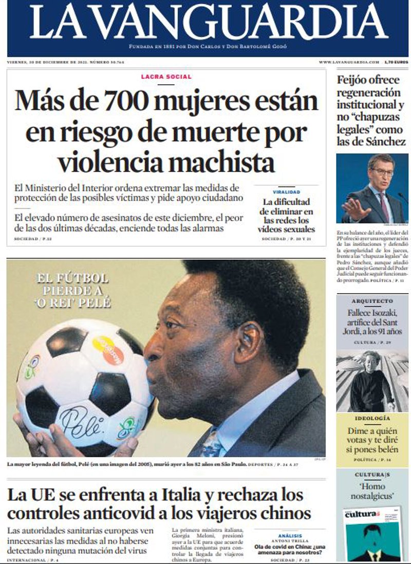 LA VANGUARDIA: "Más de 700 mujeres están en riesgo de muerte por violencia machista"; "La UE se enfrenta a Italia y rechaza los controles anticovid a los viajeros chinos"; "Feijóo ofrece regeneración institucional y no "chapuzas legales" como las de Sánchez".