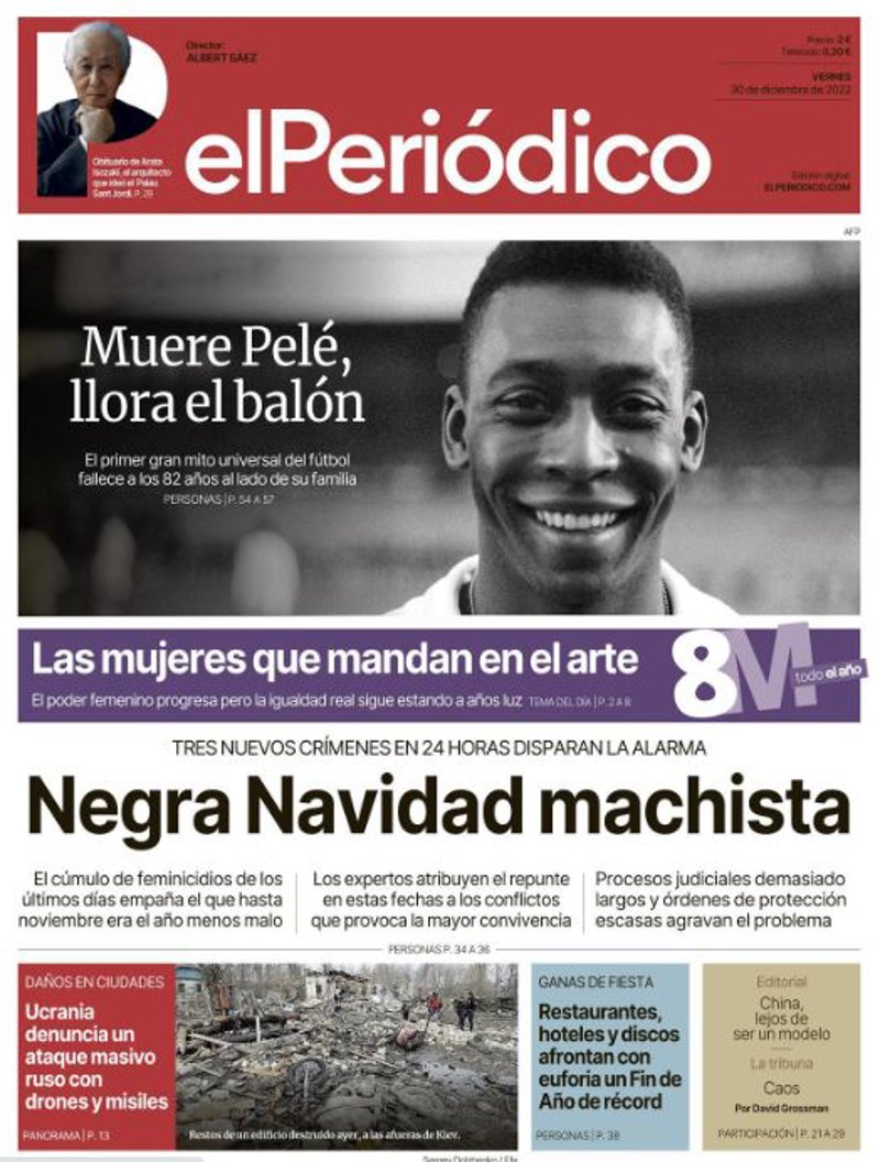 EL PERIÓDICO: "Muere Pelé, llora el balón"; "Las mujeres que mandan en el arte"; "Negra Navidad machista"; "Ucrania denuncia un ataque masivo ruso con drones y misiles"; "Restaurantes, hoteles y discos afrontan con euforia un Fin de Año de récord".