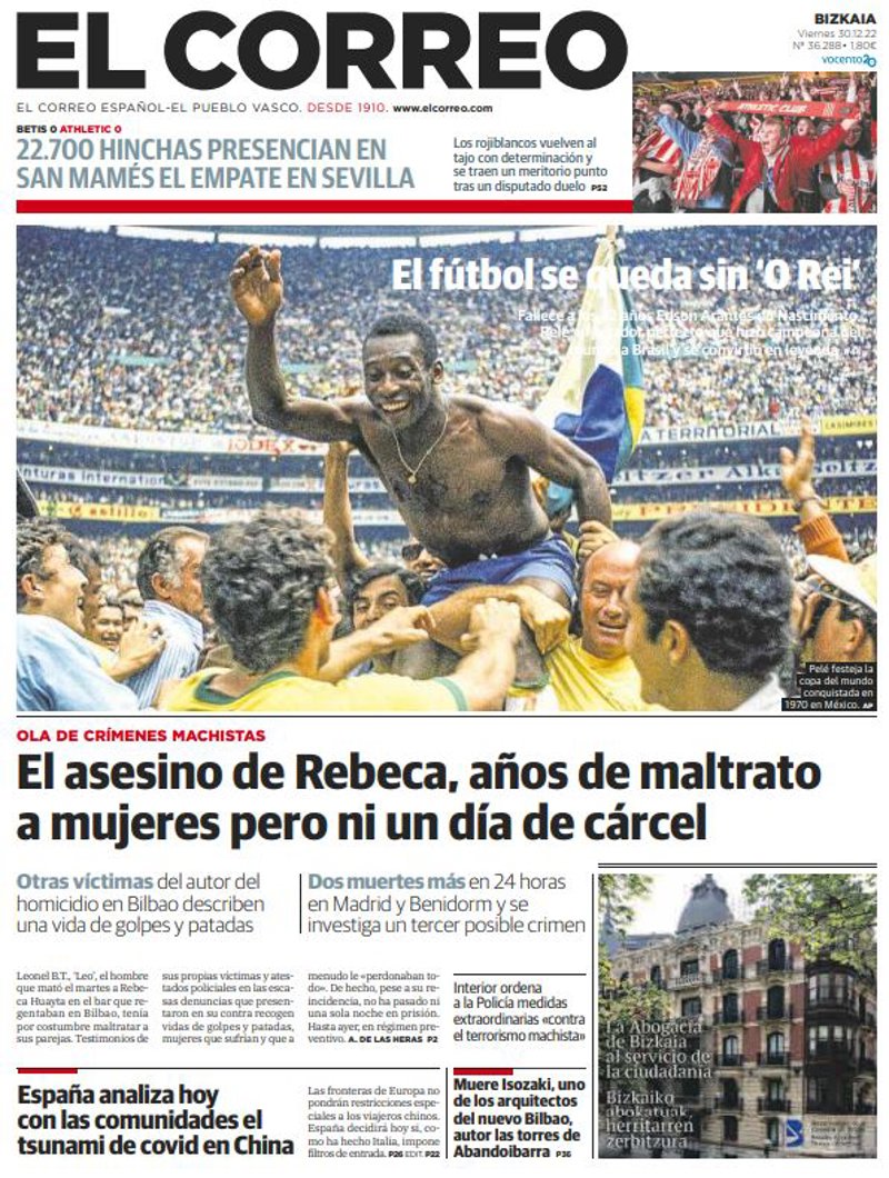 EL CORREO: "El fútbol se queda sin 'O Rei'"; "El asesino de Rebeca, años de maltrato a mujeres pero ni un día de cárcel"; "España analiza hoy con las comunidades el tsunami de covid en China"; "Muere Isozaki, uno de los arquitectos del nuevo Bilbao".