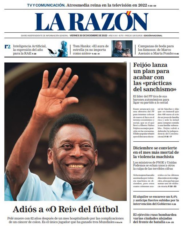 LA RAZÓN: "Adiós a "O Rei" del fútbol"; "Feijóo lanza un plan para acabar con las "prácticas del sanchismo""; "Diciembre se convierte en el mes más mortal de la violencia machista"; "El alquiler se encarece un 8,4% y anticipa fuertes subidas por la intervención del Gobierno"; "El ejército ruso bombardea varias ciudades alejadas del frente de batalla".