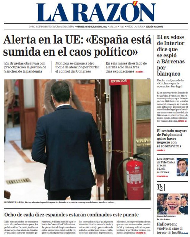 LA RAZÓN: "Alerta en la UE: "España está sumida en el caos político""; "Ocho de cada diez españoles estarán confi nados este puente"; "El ex "dos" de Interior dice que se espió a Bárcenas por blanqueo"; "El "estado mayor" de Puigdemont quiso hacer negocio con el coronavirus"; "Los ingresos de Telefónica crecen 10.461 millones".