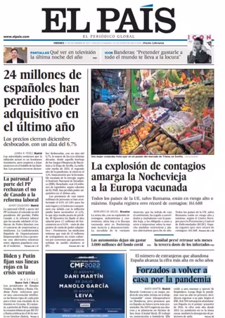 EL PAÍS: "24 millones de españoles han perdido poder adquisitivo en el último año"; "La explosión de contagios amarga la Nochevieja a la Europa vacunada"; "La patronal y parte del PP rechazan el no de Casado a la reforma laboral"; "Biden y Putin fijan sus líneas rojas en la crisis ucrania"; "Forzados a volver a casa por la pandemia".
