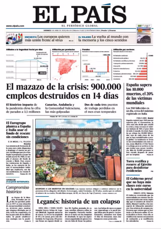 EL PAÍS: "El mazazo de la crisis: 900.000 empleos destruidos en 14 días"; "Despedir a los muertos en soledad"; "Leganés: historia de un colapso"; "El Eurogrupo plantea a España e Italia usar el fondo de rescate sin condiciones"; "España supera los 10.000 muertos,el20% de las víctimas mundiales"; "Torra rectifica y recurre al Ejército para desinfectar residencias"; "El Gobierno prevé que no haya más clases este curso en la universidad".