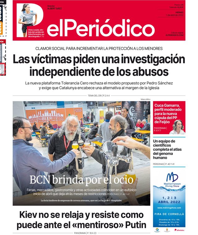 EL PERIÓDICO: "Las víctimas piden una investigación independiente de los abusos"; "Kiev no se relaja y resiste como puede ante el mentiroso Putin"; "Cuca Gamarra, peril moderado para la nueva cúpula del PP de Feijóo"; "Un equipo de científicos completa el atlas del genoma humano".