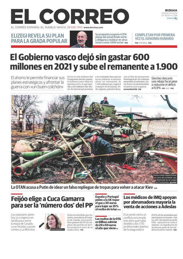 EL CORREO: "El Gobierno vasco dejó sin gastar 600 millones en 2021 y sube el remanente a 1.900"; "Feijóo elige a Cuca Gamarra para ser la 'número dos' del PP"; "España y Portugal piden a la UE topar el gas a 30 euros para bajar un 35% el recibo de la luz"; "Las multas de la OTA en Bilbao subirán de 20 a 50 euros el año que viene"; "Los médicos de IMQ apoyan por abrumadora mayoría la venta de acciones a Adeslas".