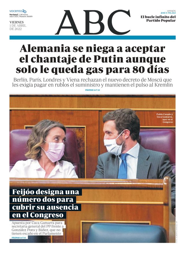 ABC: "Alemania se niega a aceptar el chantaje de Putin aunque solo le queda gas para 80 días"; "Feijóo designa una número dos para cubrur su ausencia en el Congreso".