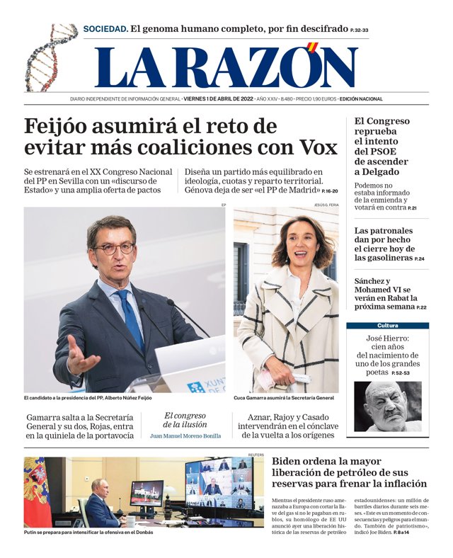 LA RAZÓN: "El genoma humano completo, por fin descifrado"; "Feijóo asumirá el reto de evitar más coaliciones con Vox"; "El Congreso reprueba el intento del PSOE de ascender a Delgado"; "Las patronales dan por hecho el cierre hoy de las gasolineras"; "Sánchez y Mohamed VI se verán en Rabat la próxima semana"; "Biden ordena la mayor liberación de petróleo de sus reservas para frenar la inflación".