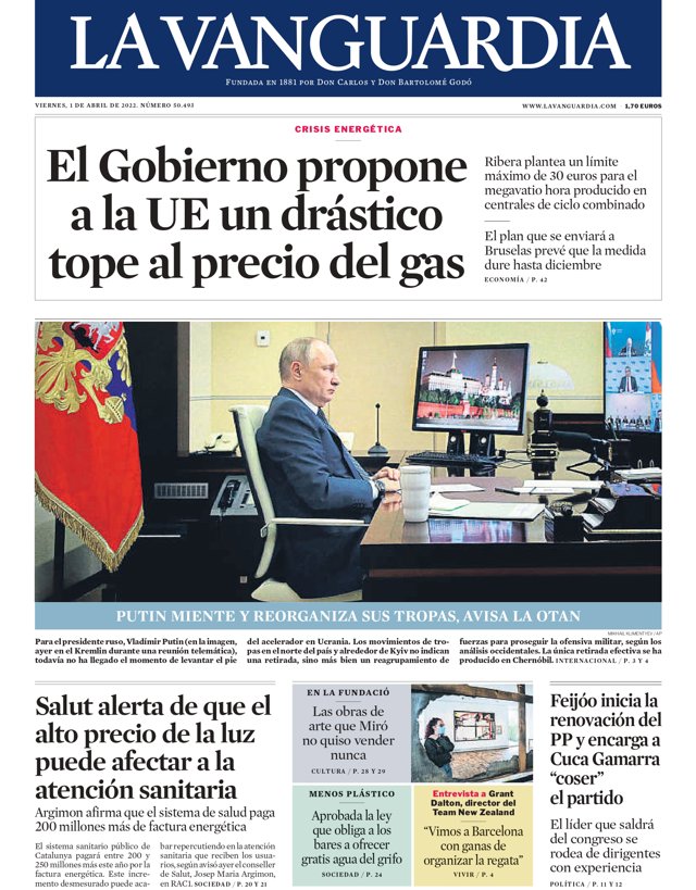LA VANGUARDIA: "El Gobierno propone a la UE un drástico tope al precio del gas"; "Salut alerta de que el alto precio de la luz puede afectar a la atención sanitaria"; "Feijóo inicia la renovación del PP y encarga a Cuca Gamarra "coser" el partido".