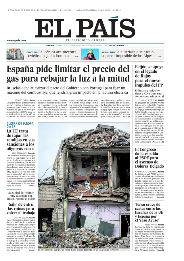 EL PAÍS: "España pide limitar el precio del gas para rebajar la luz a la mitad"; "La UE trata de tapar las rendijas en sus sanciones a los oligarcas rusos"; "Salir de entre las ruinas para volver al trabajo"; "Feijóo se apoya en el legado de Rajoy para el nuevo impulso del PP"; "El Congreso de la espalda al PSOE para el ascenso de Dolores Delgado"; "Tenso cruce de cartas entre las fiscalías de la UE y España por el 'caso Ayuso'".