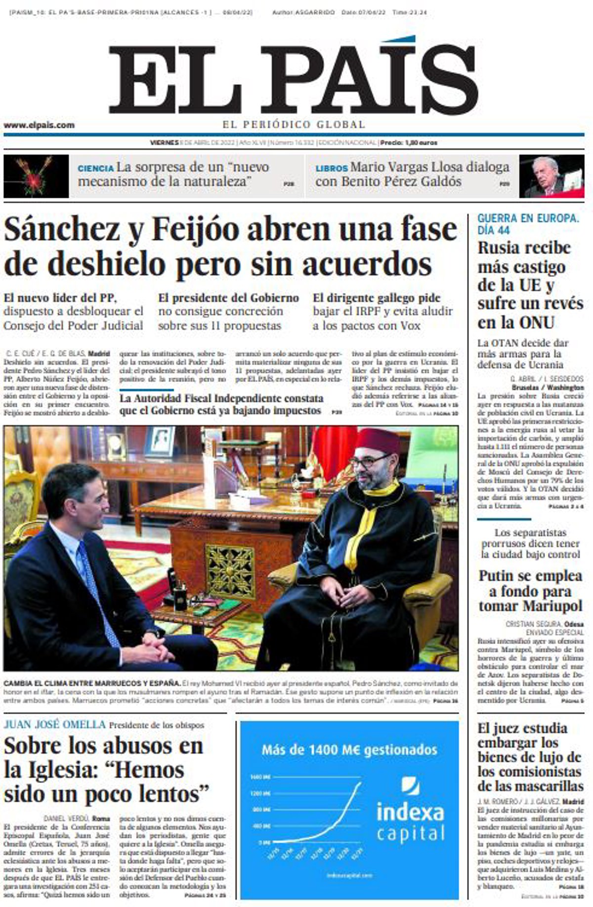 EL PAÍS: "Sánchez y Feijóo abren una fase de deshielo pero sin acuerdos"; "Juan José Omella, presidente de los obispos. Sobre los abusos en la Iglesia: "Hemos sido un poco lentos""; "Rusia recibe más castigo de la UE y sufre un revés en la ONU"; "Putin se emplea a fondo para tomar Mariupol"; "El juez estudia embargar los bienes de lujo de los comisionistas de las mascarillas".