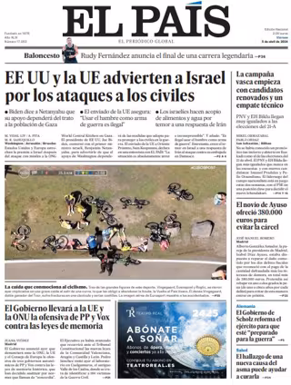 EL PAÍS: "EE UU y la UE advierten a Israel por los ataques a los civiles"; "El Gobierno llevará a la UE y la ONU la ofensiva de PP y Vox contra las leyes de memoria"; "La campaña vasca empieza con candidatos renovados y un empate técnico"; "El novio de Ayuso ofreció 380.000 euros para evitar la cárcel"; "El Gobierno de Scholz reforma el ejército para que esté "preparado para la guerra"; "El hallazgo de una nueva causa del asma puede ayudar a curarla".