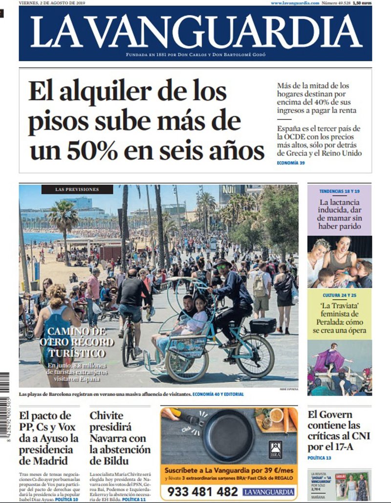 LA VANGUARDIA: "El alquiler de los pisos sube más de un 50% en seis años"; "Camino de otros récord turístico. En junio, 8,8 millones de turistas extranjeros visitaron España"; "El pacto de PP, Cs y Vox da a Ayuso la presidencia de Madrid"; "Chivite presidirá Navarra con la abstención de Bildu"; "El Govern contiene las críticas al CNI por el 17-A".