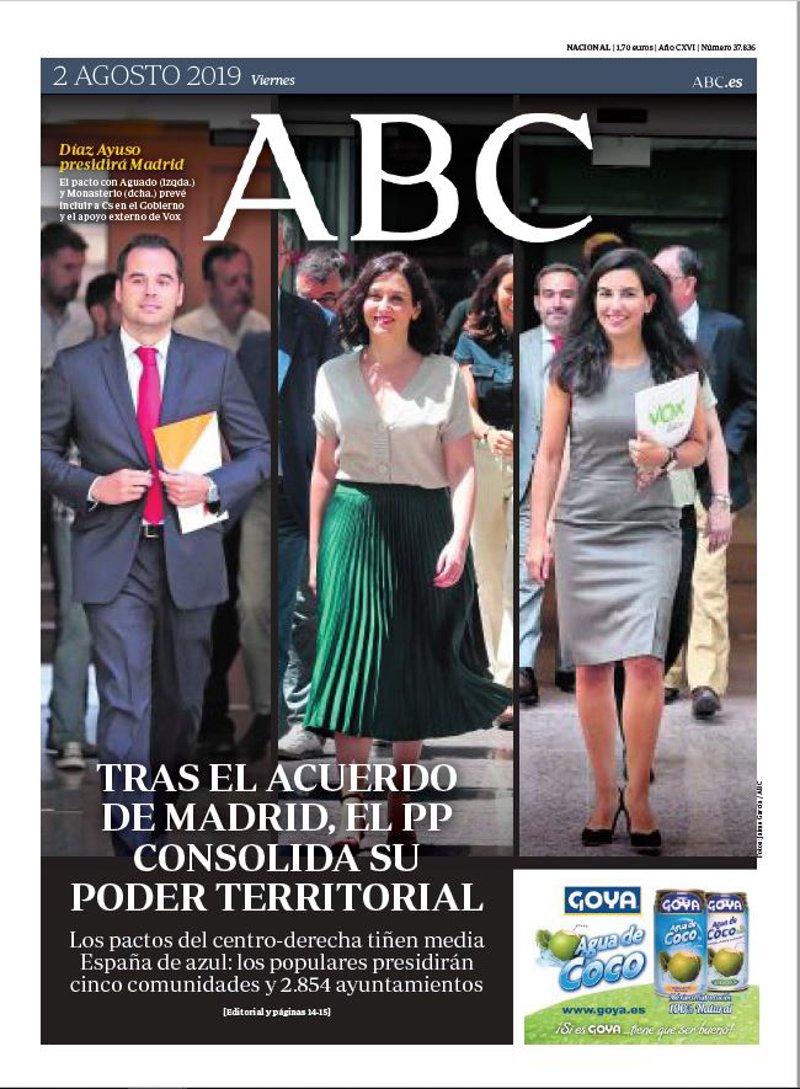 ABC: "Tras el acuerdo de Madrid, el PP consolida su poder territorial. Los pactos del centro-derecha tiñen media España de azul: los populares presidirán cinco comunidades y 2.854 ayuntamientos".