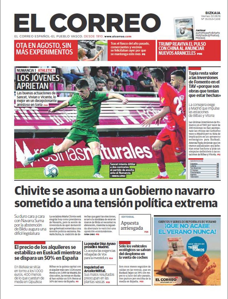 EL CORREO: "Los jóvenes aprietan. Numancia 1 Athletic 1. Las buenas actuaciones de Sancet, Vivian y Vicente, lo mejor en un decepcionante amistoso en Soria"; "Chivite se asoma a un Gobierno navarro sometido a una tensión política extrema"; "Tapia resta valor a las inversiones de Fomento en el TAV "porque son obras que tenían que estar hechas""; "El precio de los alquileres se estabiliza en Euskadi mientras se dispara un 50% en España".